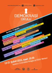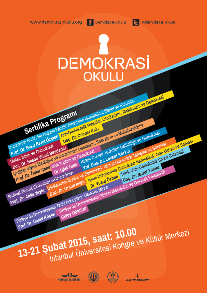 Hukukçular Derneği’nin sahipliğinde; İstanbul Üniversitesi, Gençlik ve Spor Bakanlığı ve Lale Organizasyon desteği ile Demokrasi Okulu Sertifika Programı’nı 2015 yılının 13-21 Şubat günlerinde gerçekleştirerek 12 ders verildi; demokrasi kavramı, demokrasi- hukuk- uluslararası ilişkiler ve ekonomi arasındaki ilişki, Türkiye’de ve İslam dünyasında demokrasi hareketleri gibi konular her yönüyle tartışıldı. Bunun yanı sıra katılımcıların sertifika programı hakkında ayrıntılı bilgiye ulaşabilmeleri için www.demokrasiokulu.org internet adresini oluşturduk.