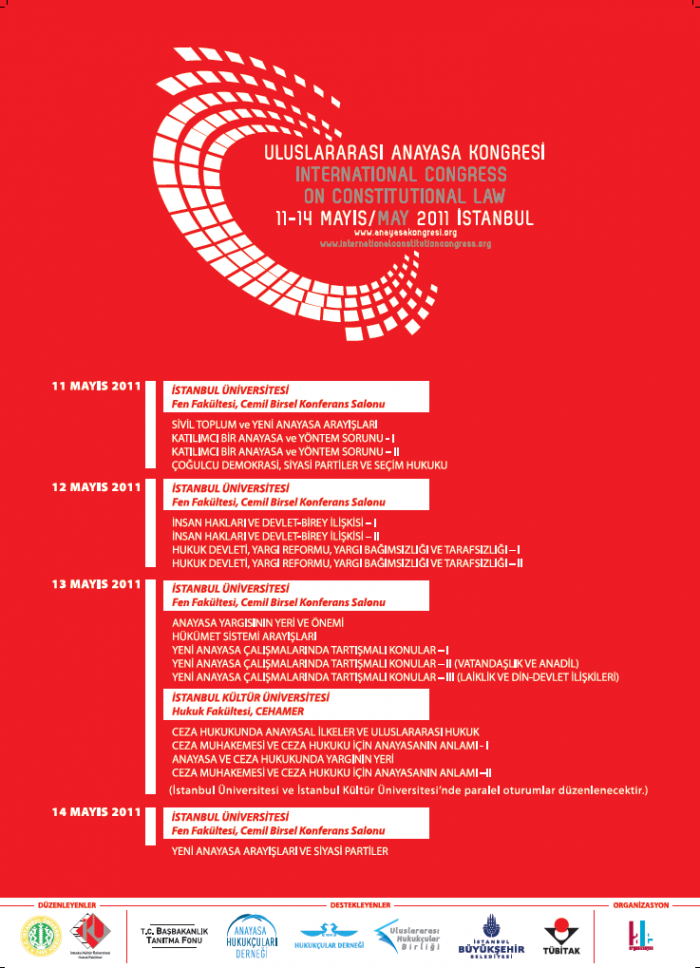 11-14 Mayıs 2011 tarihinde yapılan Uluslararası Anayasa Kongresini, Anayasa hukukçular Derneği, İstanbul Üniversitesi, İstanbul Kültür Üniversitesi tarafından düzenlendi. Bununla birlikte katılımcıların kongre hakkında ayrıntılı bilgiye ulaşabilmeleri için www.anayasakongresi.org internet adresini kullanıma açtık.