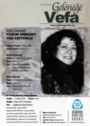 Geleneksel sanatlar alanında büyük eserler vermiş, pek çok sanatçı yetiştirmiş ve vefat etmiş, yani geleneksel sanatların gelişimine büyük katkıları olmuş ve yön vermiş üstadları hem gelecek kuşaklara tanıtmak hem de onlara olan vefa borcumuzu ödemek amacıyla düzenlediğimiz etkinlikler dizisinin ikincisinde Füsun Arıkan’ı 30 Mart 2013’te yad ettik. Bununla birlikte katılımcılar, ayrıntılı bilgiye ulaşabilmeleri için www.gelenegevefa.org internet adresini kullanıma açtık.